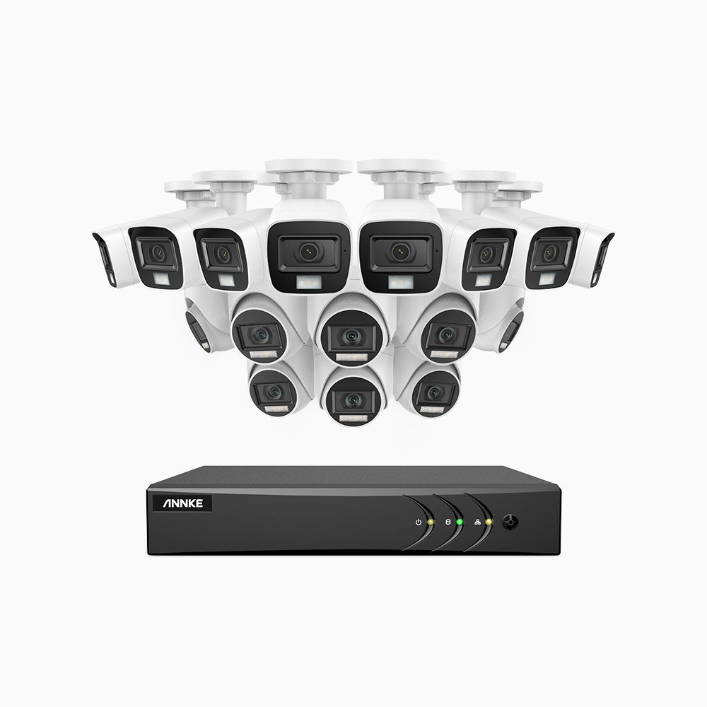 ADLK500 - 3K 16 Kanal außen Kabelgebunden Überwachungskamera-Set mit 8 Bullet Kameras & 8 Turm Kameras, Zwei Lichtern Nachtsicht, f/1.2 Superblende, 4-in-1 Ausgangssignal, Eingebautes Mikrofon, IP67 wetterfest