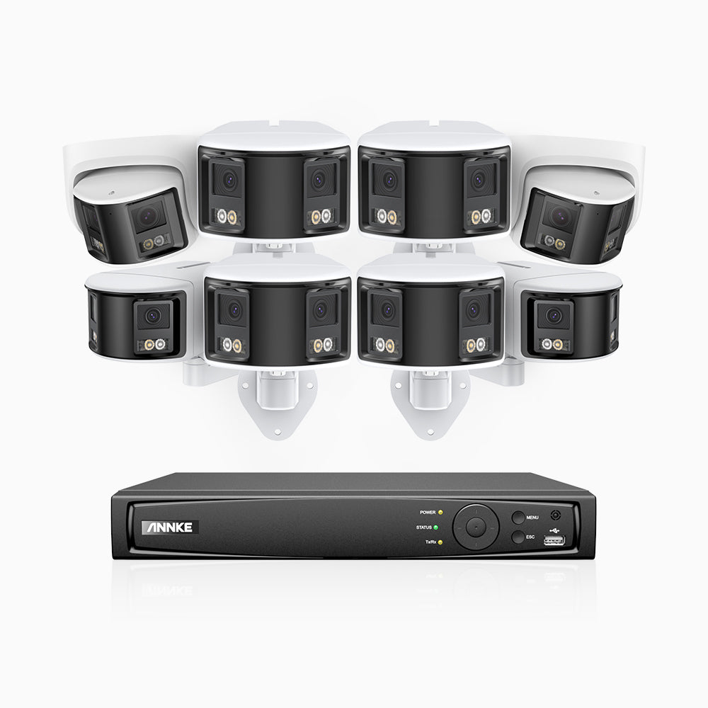 FDH600 - 6MP 16 Kanal PoE Panorama Überwachungskamera-Set mit 6 Bullet Kameras & 2 Turm Kameras, zwei Objektiven, 180° Ultraweitwinkel, f/1.2 Superblende, BSI-Sensor, integriertes Mikrofon, aktive Sirene und Alarm, Personen-und Fahrzeugerkennung