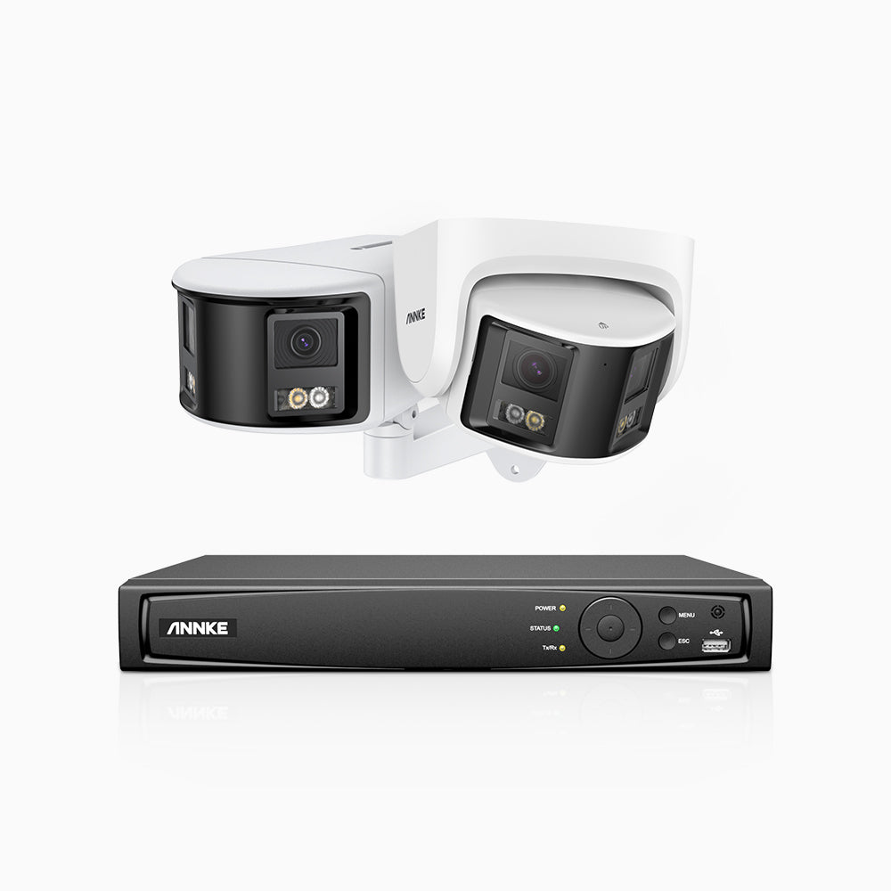 FDH600 - 6MP 8 Kanal PoE Panorama Überwachungskamera-Set mit 1 Bullet Kameras & 1 Turm Kameras, zwei Objektiven, 180° Ultraweitwinkel, f/1.2 Superblende, BSI-Sensor, integriertes Mikrofon, aktive Sirene und Alarm, Personen-und Fahrzeugerkennung