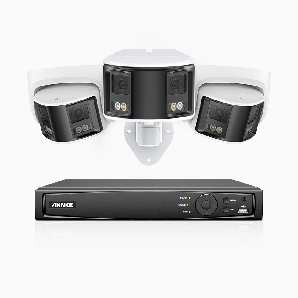 FDH600 - 6MP 8 Kanal PoE Panorama Überwachungskamera-Set mit 1 Bullet Kameras & 2 Turm Kameras, zwei Objektiven, 180° Ultraweitwinkel, f/1.2 Superblende, BSI-Sensor, integriertes Mikrofon, aktive Sirene und Alarm, Personen-und Fahrzeugerkennung