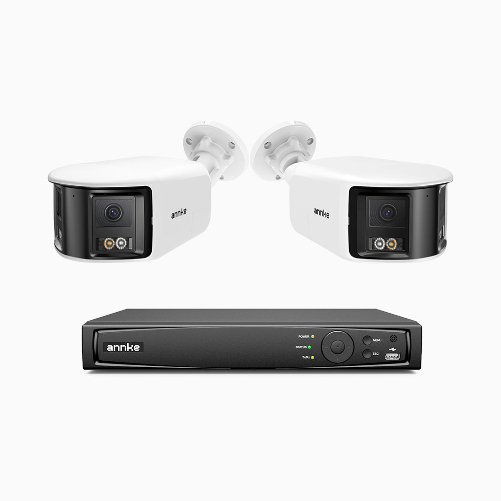 FDH600 - 6MP 8 Kanal PoE Panorama Überwachungskamera-Set mit 2 Kameras, zwei Objektiven, 180° Ultraweitwinkel, f/1.2 Superblende, BSI-Sensor, integriertes Mikrofon, aktive Sirene und Alarm, Personen-und Fahrzeugerkennung