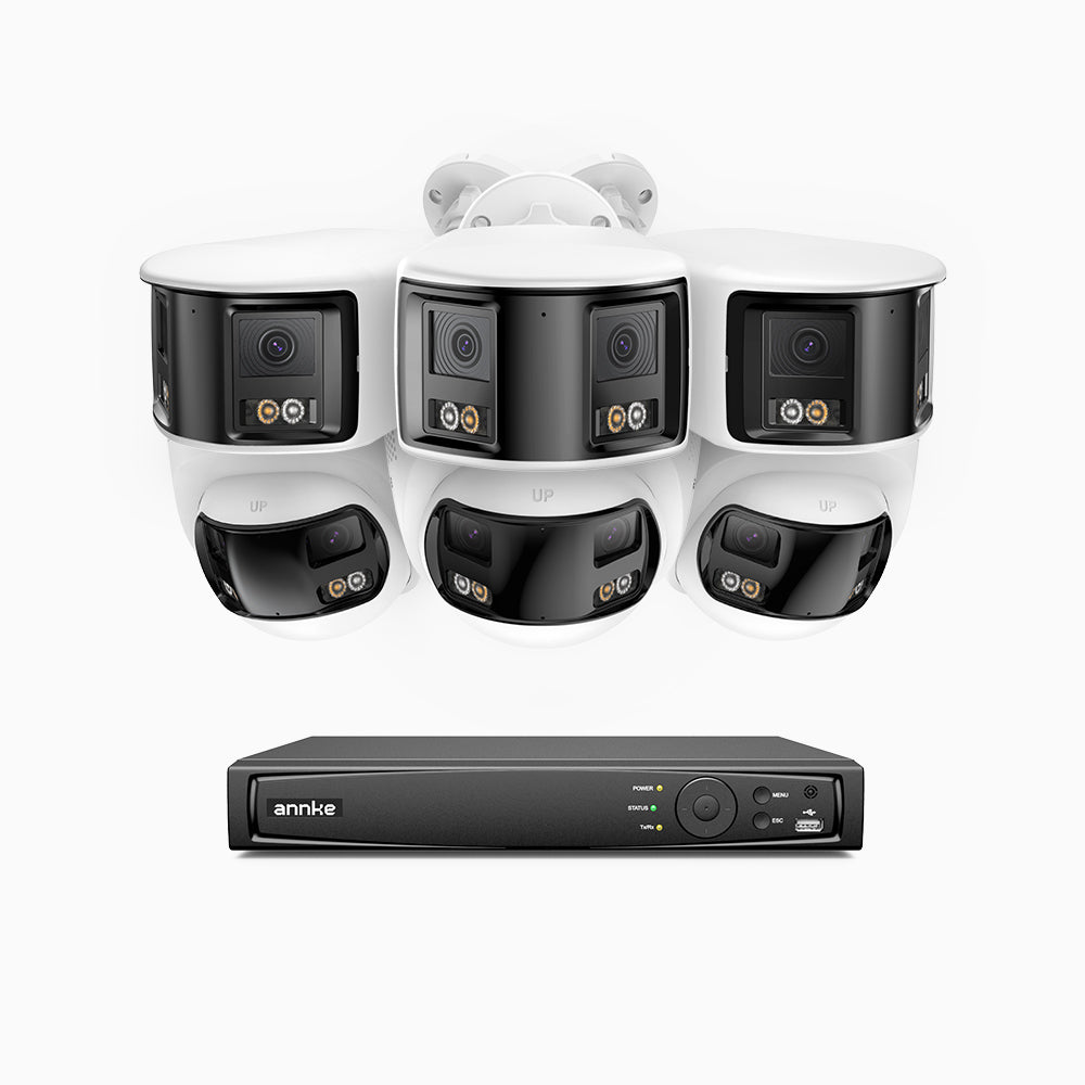 FDH600 - 6MP 8 Kanal PoE Panorama Überwachungskamera-Set mit 3 Bullet Kameras & 3 Turm Kameras, zwei Objektiven, 180° Ultraweitwinkel, f/1.2 Superblende, BSI-Sensor, integriertes Mikrofon, aktive Sirene und Alarm, Personen-und Fahrzeugerkennung