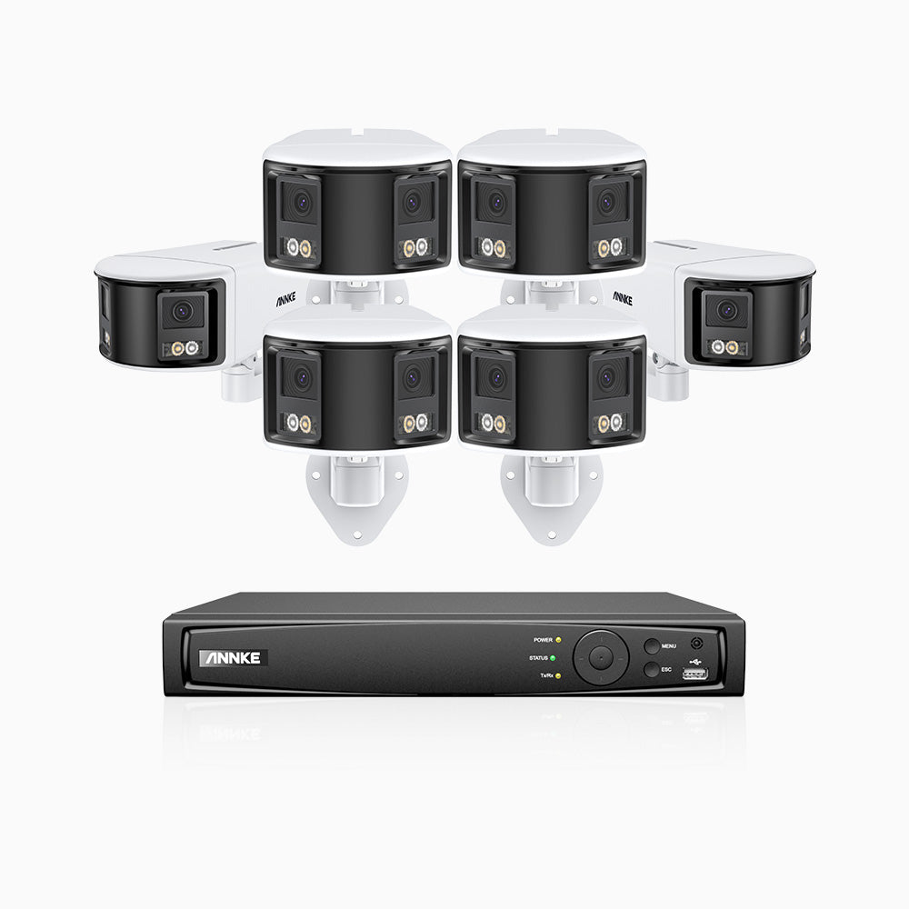 FDH600 - 6MP 8 Kanal PoE Panorama Überwachungskamera-Set mit 6 Kameras, zwei Objektiven, 180° Ultraweitwinkel, f/1.2 Superblende, BSI-Sensor, integriertes Mikrofon, aktive Sirene und Alarm, Personen-und Fahrzeugerkennung