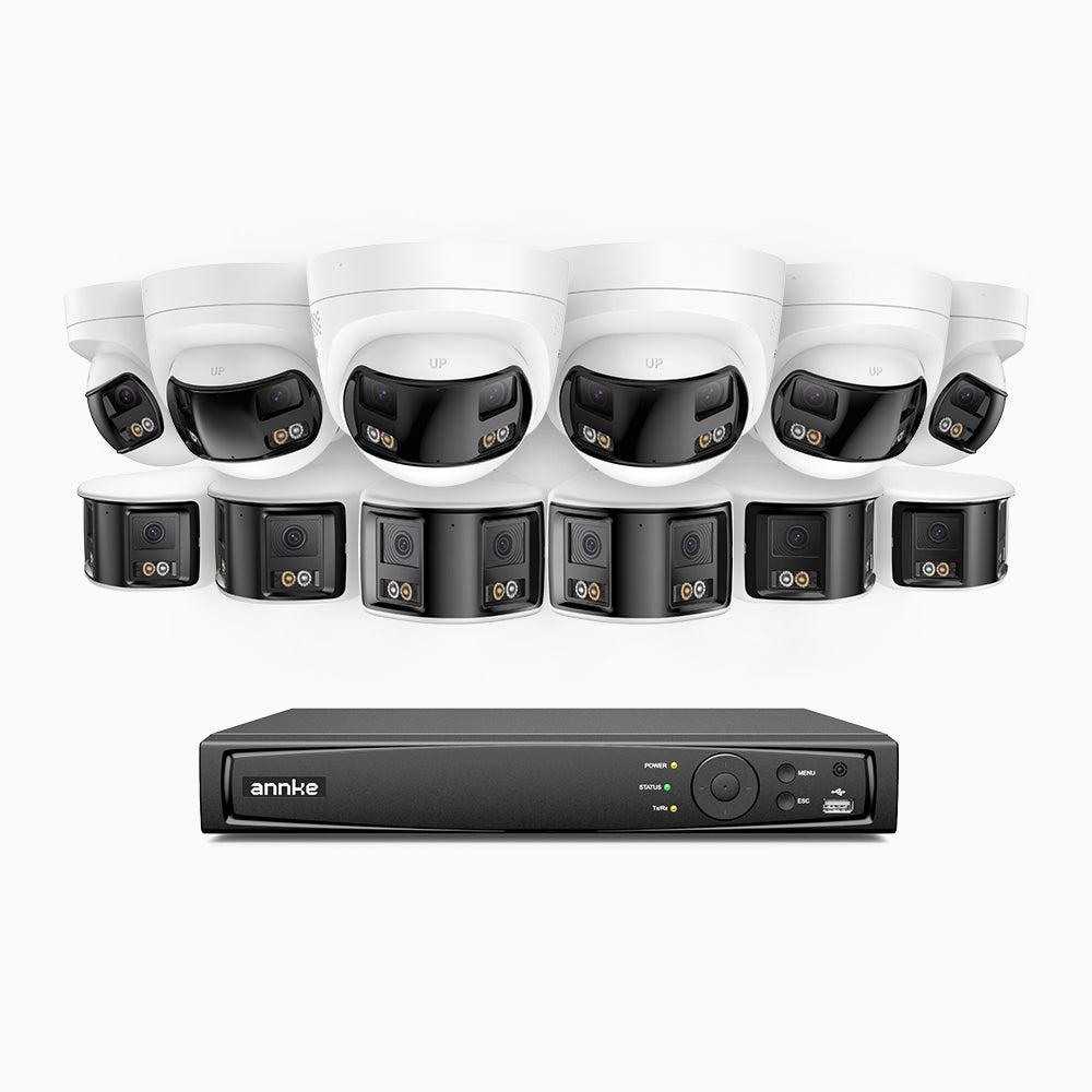 FDH800 - 4K 16 Kanal PoE Panorama Überwachungskamera-Set mit 6 Bullet Kameras & 6 Turm Kameras, zwei Objektiven, 180° Ultraweitwinkel, intelligenter Dual-Licht-Nachtsicht, Zwei-Wege-Audio, aktivem Sirenenton & Alarm, Personen- & Fahrzeugerkennung, IP67