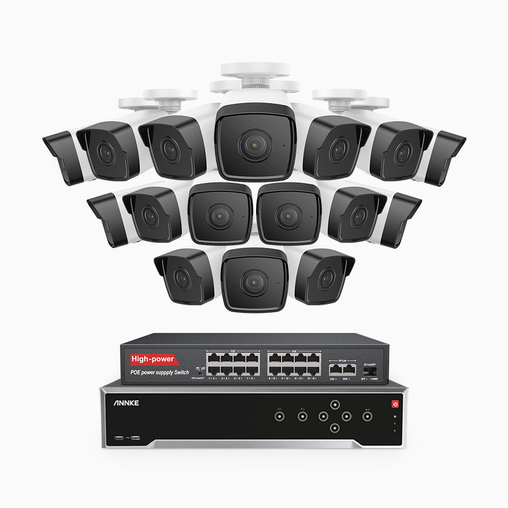 H500 - 3K 32 Kanal PoE Überwachungskamera-Set mit 16 Kameras, Eingebautes Mikrofon & SD-Kartensteckplatz, funktioniert mit Alexa, Inklusive 16-Port-PoE-Switch, EXIR Nachtsicht 2.0, IP67