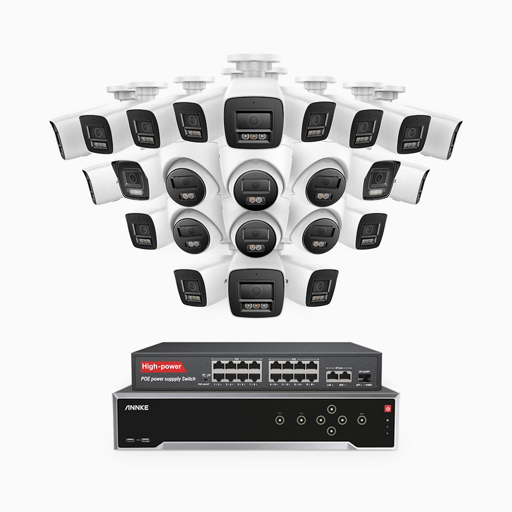 H800 - 4K 32 Kanal PoE Überwachungskamera-Set mit 18 Bullet Kameras & 6 Turm Kameras, Farbe & IR Nachtsicht, Personen- und Fahrzeugerkennung, Eingebautes Mikrofon, 96° Sichtfeld, Unterstützt RTSP, Inklusive 16-Port-PoE-Switch