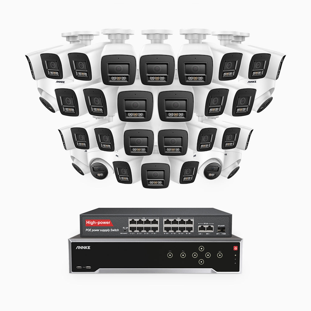 H800 - 4K 32 Kanal PoE Überwachungskamera-Set mit 26 Bullet Kameras & 6 Turm Kameras, Farbe & IR Nachtsicht, Personen- und Fahrzeugerkennung, Eingebautes Mikrofon, 96° Sichtfeld, Unterstützt RTSP, Inklusive 16-Port-PoE-Switch