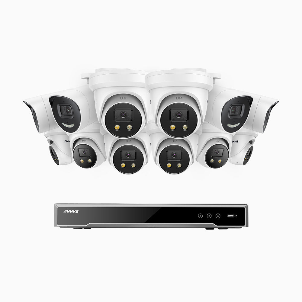 H800X - 4K 16 Kanal PoE Überwachungskamera-Set mit 4 Bullet Kameras & 8 Turm Kameras, 1/1.8'' BSI Sensor, f/1.6 Aperture (0.003 Lux), alarmierung mit sirene und blitzlicht, 2CH 4K-Dekodierungsfunktion, personen- und fahrzeugerkennung, perimeterschutz