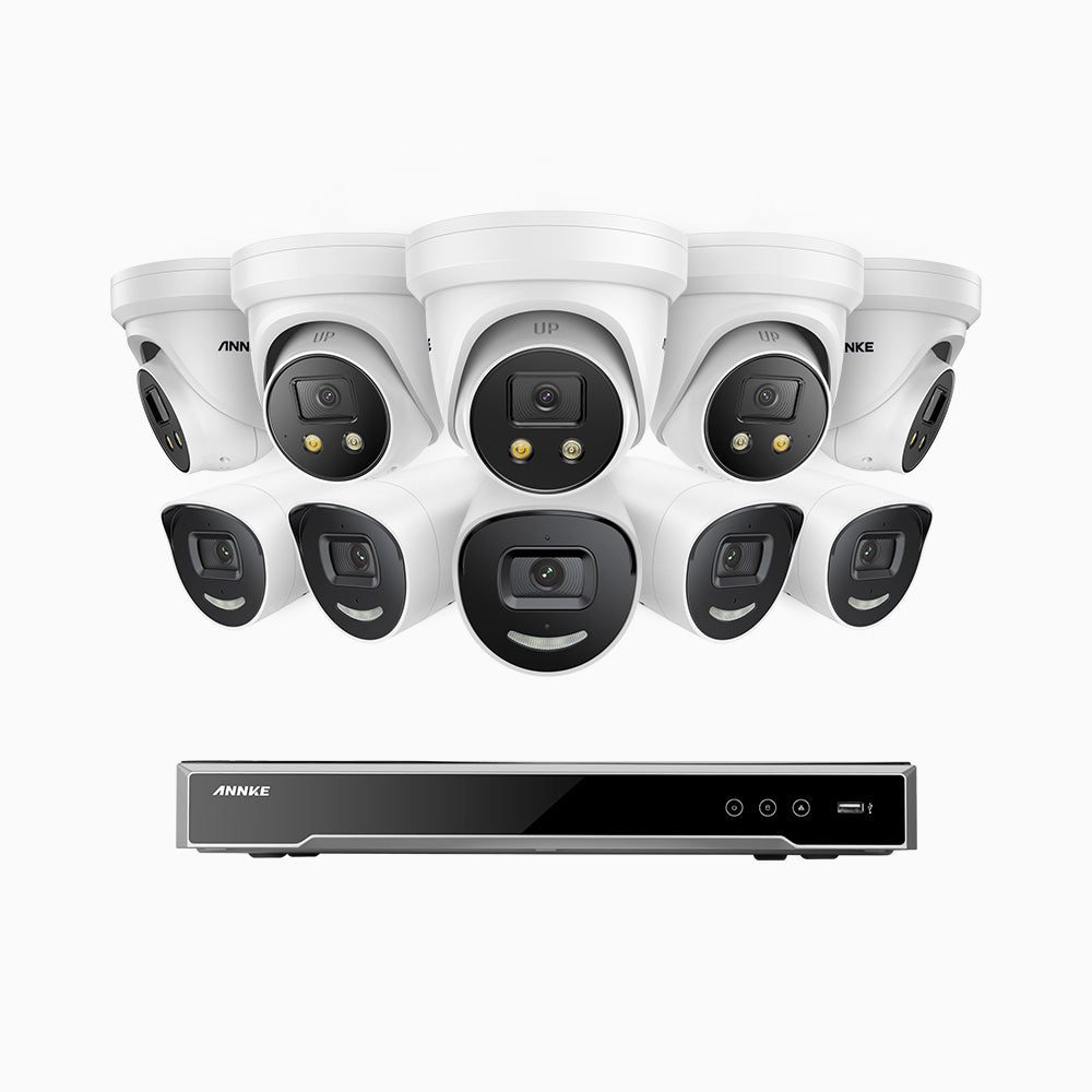 H800X - 4K 16 Kanal PoE Überwachungskamera-Set mit 5 Bullet Kameras & 5 Turm Kameras, 1/1.8'' BSI Sensor, f/1.6 Aperture (0.003 Lux), alarmierung mit sirene und blitzlicht, 2CH 4K-Dekodierungsfunktion, personen- und fahrzeugerkennung, perimeterschutz