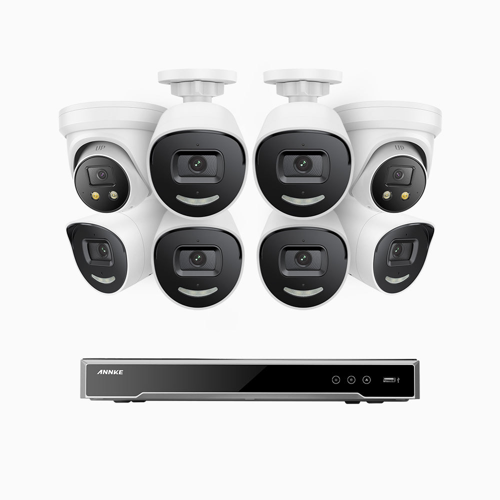 H800X - 4K 16 Kanal PoE Überwachungskamera-Set mit 6 Bullet Kameras & 2 Turm Kameras, 1/1.8'' BSI Sensor, f/1.6 Aperture (0.003 Lux), alarmierung mit sirene und blitzlicht, 2CH 4K-Dekodierungsfunktion, personen- und fahrzeugerkennung, perimeterschutz