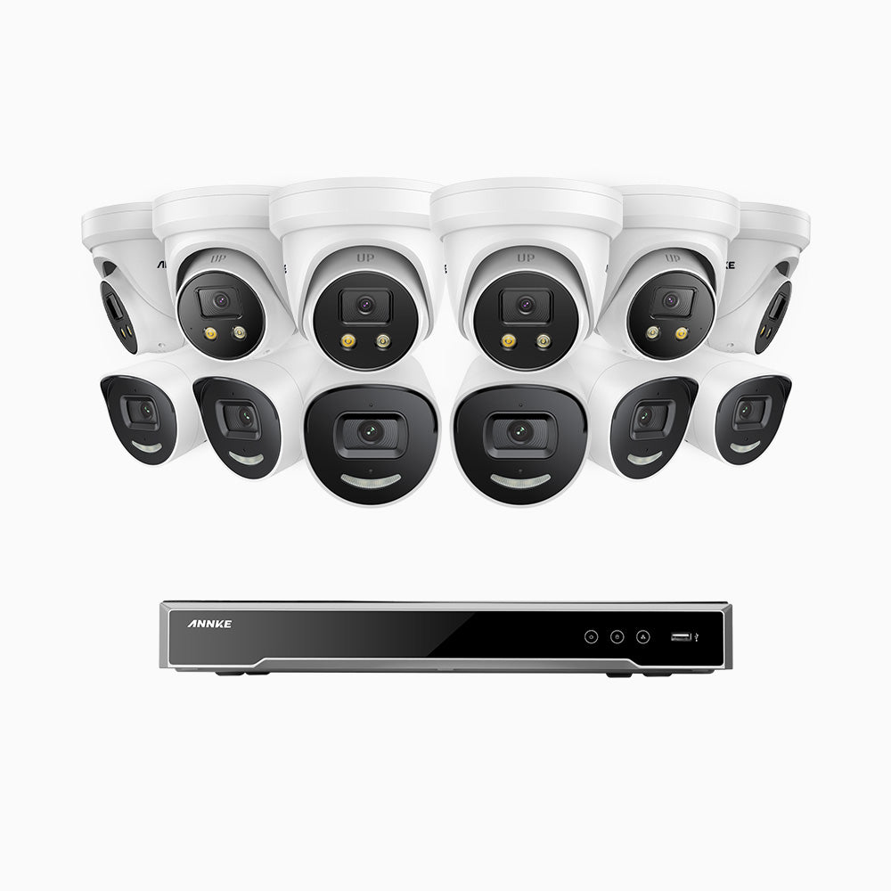 H800X - 4K 16 Kanal PoE Überwachungskamera-Set mit 6 Bullet Kameras & 6 Turm Kameras, 1/1.8'' BSI Sensor, f/1.6 Aperture (0.003 Lux), alarmierung mit sirene und blitzlicht, 2CH 4K-Dekodierungsfunktion, personen- und fahrzeugerkennung, perimeterschutz