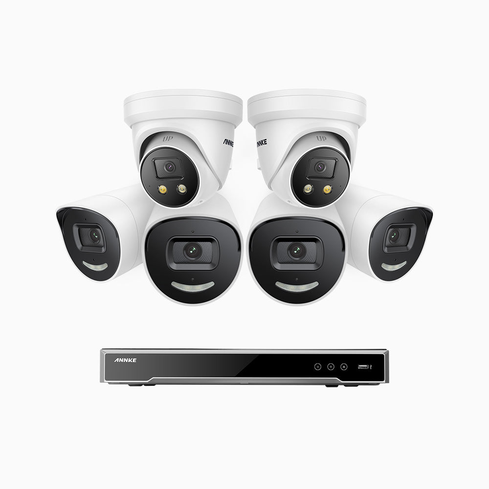 H800X - 4K 8 Kanal PoE Überwachungskamera-Set mit 4 Bullet Kameras & 2 Turm Kameras, 1/1.8'' BSI Sensor, f/1.6 Aperture (0.003 Lux), alarmierung mit sirene und blitzlicht, 2CH 4K-Dekodierungsfunktion, personen- und fahrzeugerkennung, perimeterschutz