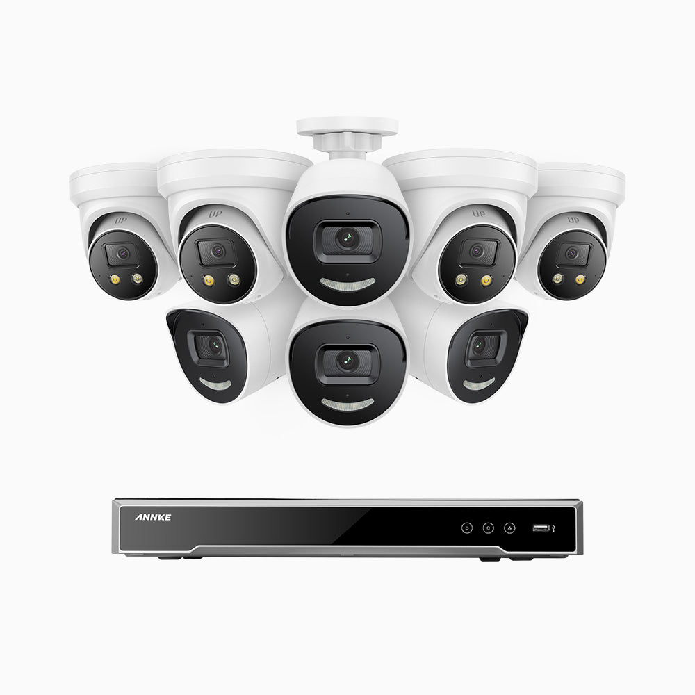 H800X - 4K 8 Kanal PoE Überwachungskamera-Set mit 4 Bullet Kameras & 4 Turm Kameras, 1/1.8'' BSI Sensor, f/1.6 Aperture (0.003 Lux), alarmierung mit sirene und blitzlicht, 2CH 4K-Dekodierungsfunktion, personen- und fahrzeugerkennung, perimeterschutz
