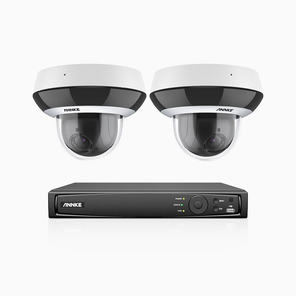 HZ504P - 8 Kanal Überwachungssystem mit 2 PTZ PoE Kameras, 3K-Auflösung, 4X Optischer Zoom, Objektiv 2,8-12 mm, Intelligente Verhaltensanalyse, IK10 Vandalensichere, Farbnachtsicht, Antibeschlag