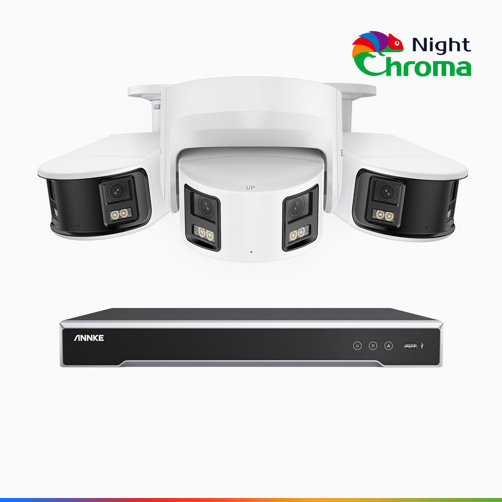 NightChromaTM NDK800 - 4K 8 Kanal PoE Panorama Überwachungskamera-Set mit 2 Bullet Kameras & 1 Turm Kamera, Doppelobjektiv, Farbnachtsicht, mit f/1.0 Super Aperture (0,0005 Lux), aktiver Sirene und Blitz, Personen-und Fahrzeugerkennung