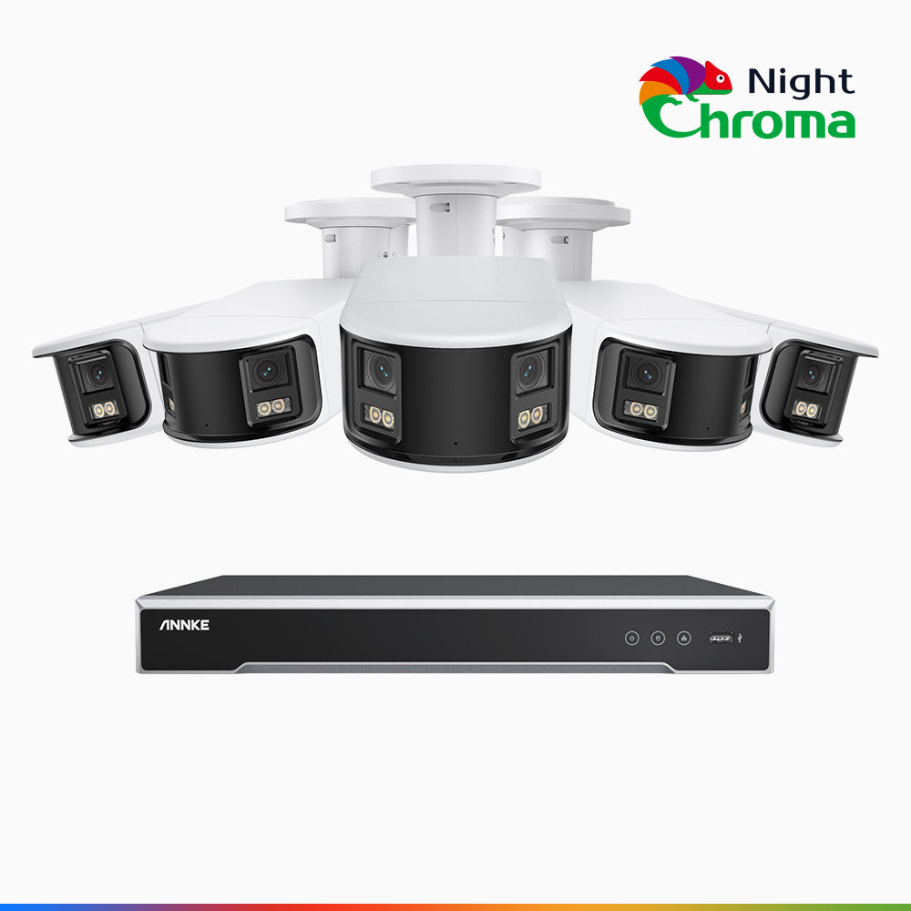 NightChromaTM NDK800 - 4K 8 Kanal PoE Panorama Überwachungskamera-Set mit 5 Kameras, Doppelobjektiv, Farbnachtsicht, mit f/1.0 Super Aperture (0,0005 Lux), aktiver Sirene und Blitz, Personen-und Fahrzeugerkennung